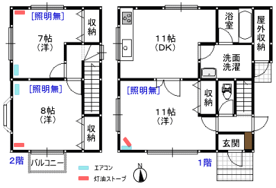 | 備付設備; 浴室(追い炊き)、トイレ(TOTO)、給湯ボイラ−(灯油)、屋外物置、エアコン×3機、FF暖房機×3台 |