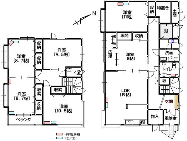| 備付設備; 浴室(追い炊き)、トイレ×2、給湯ボイラ−(灯油)、エアコン×5機、FF暖房機×6台 |
